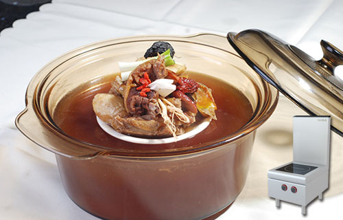 煨湯火候的要訣是大火燒沸(東方和利:電磁低湯灶),小火慢煨。一方面可使食物的鮮香物質(zhì)盡可能地溶解出來(lái),另一方面使湯清不渾濁。
