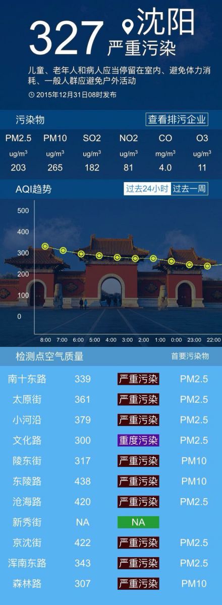 今天夜間最低氣溫-15℃,有中度霾。明天1月1日氣溫回暖,最高氣溫2℃,最低氣溫-8℃,不過天空被云層遮蓋,云層和地面之間仍然有中度霾。