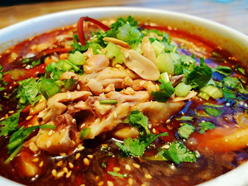 3、調(diào)味裝缽。雞片放盆內(nèi)加入精鹽、紅油辣椒、花椒、花椒粉、白糖、味精拌和均勻,裝上陶罐上桌,舀一碗雞湯配食。