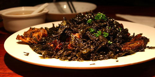 這道菜和外婆家品牌一樣有名,當屬外婆家暢銷菜的"當家花旦"。茶香鴨選用2斤左右的嫩鴨做原料,先將嫩鴨鹵制入味,再改刀放入油鍋炸至約8成熟,使其表面呈金黃色,再放入龍井茶葉爆香,此款菜品外脆內(nèi)嫩、微辣咸鮮,保留了鴨子本身的鮮味又增強了鴨子表皮的口感。
