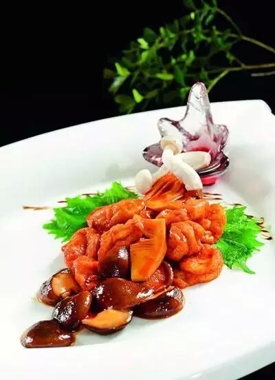 2、鍋內(nèi)放入菜子油,倒入事先煨制好的魚(yú)面筋、春筍、香菇,淋入蠔油、剩余的雞湯大火燒開(kāi),用鹽、白糖調(diào)味,淋入濕淀粉勾芡,出鍋前淋入蔥油即可。