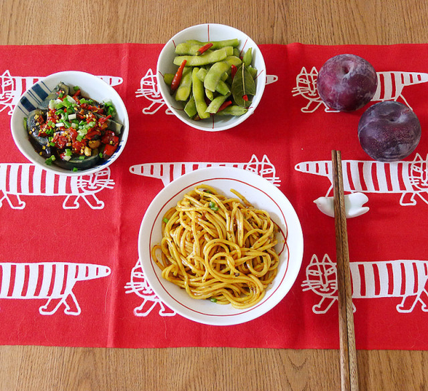 涼面,剁椒拌皮蛋,煮毛豆和黑布林