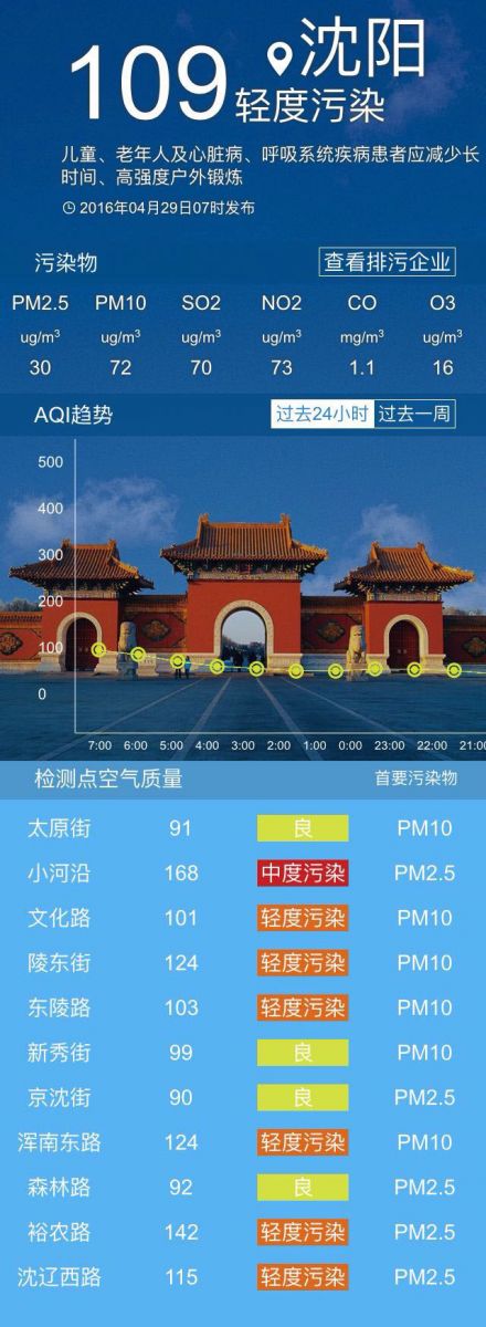 下面共同關(guān)注沈陽(yáng)未來(lái)幾天的具體天氣情況:今天中午以前陽(yáng)光明媚,中午以后云量快速增多,并且在下午五點(diǎn)前后,沈陽(yáng)地區(qū)將會(huì)自西向東開始有雨點(diǎn)飄落,一直持續(xù)到今天夜間。今天白天的最高氣溫為18℃左右,南風(fēng)3-4級(jí),空氣質(zhì)量輕度污染;今天夜間的最低氣溫為11℃左右。