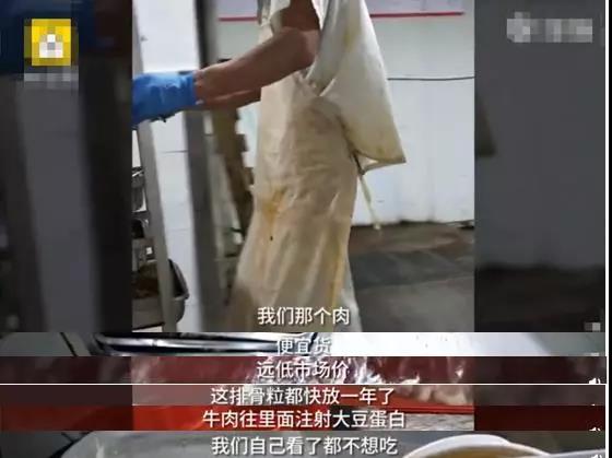 所選食材都是大量劣質(zhì)食品,排骨放置時(shí)間快一年!牛肉注射大豆蛋白!員工表示自己看了惡心都不想吃!