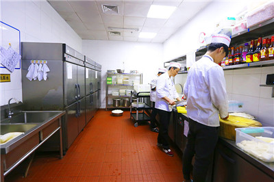 廚房的燈光:餐廳的燈光重文化,廚房的燈光重實用。這里的實用,主要指臨爐炒菜要有足夠的燈光以把握菜肴色澤;案板切配要有明亮的燈光,以有效防止刀傷和追求精細(xì)的刀工;出菜打荷的上方要有充足的燈光,切實減少雜草混入并流入餐廳等等。廚房燈光不一定要像餐廳一樣豪華典雅、布局整齊,但其作用絕不可忽視。