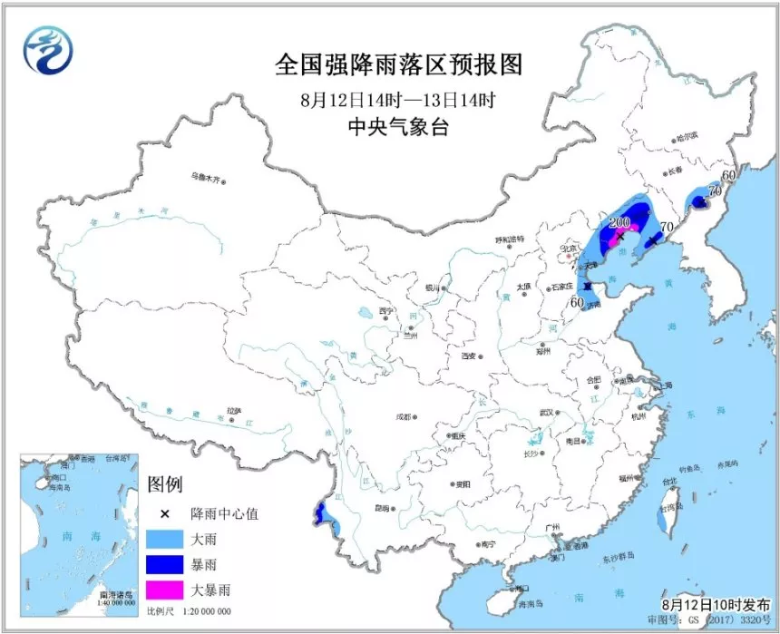 暴雨預報:預計,8月12日14時至13日14時,山東西北部、河北東部、天津、遼寧中南部、吉林東部等地有大雨或暴雨,其中,遼寧西南部的部分地區(qū)有大暴雨(100~200毫米)。上述地區(qū)最大小時降雨量20~40毫米。