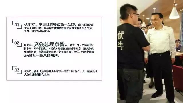 上邊這張圖片是2015年5月份克強總理來中關村訪問時的場景,當時總理主要接見了三家公司的負責人,一家是聯(lián)想集團,一家是3W咖啡,還有一家就是伏牛堂了。