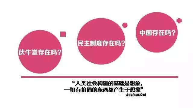 《人類簡史》這本書的作者尤瓦爾.赫拉利說過:"人類社會構(gòu)建的基礎是想象,一切有價值的東西都產(chǎn)生于想象。"例如我們今天的發(fā)布會存在嗎?其實不存在,它存在于我們的想象之中。再比如伏牛堂這家公司存在嗎?其實也是大家覺得它存在,它就存在了。民主制度存在嗎?中國存在嗎?這些其實都是我們的想象。