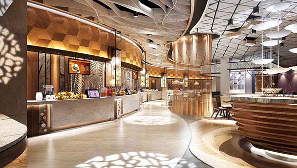 美食廣場設計方案通常采取在大空間場地的周邊布置售賣柜臺和廚房,每家店鋪占用空間較小,店面寬為3-6米,進深為6-10米,每家店鋪需要配備排油煙設備及廚房后部運輸通道。隨著生活水平不斷提高,人們對食物口味的要求越來越高,因此食物的質量是美食廣場每家店鋪競爭的關鍵,需要業(yè)主配備精良的廚房設備。
