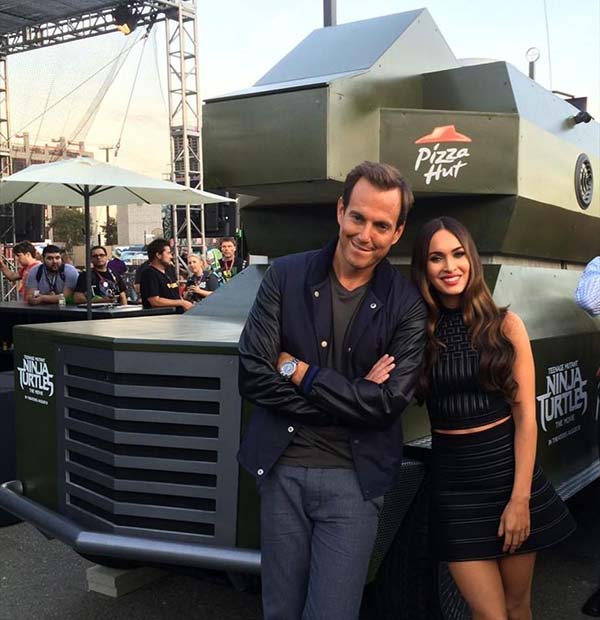 電影中的兩位主要演員威爾·阿奈特與梅根·??怂挂苍谂_噴射車旁合影。