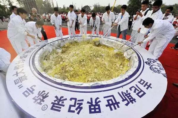 據(jù)了解,2015年是揚(yáng)州建城2500周年,世界中國(guó)烹飪聯(lián)合會(huì)、揚(yáng)州市旅游局、揚(yáng)州市烹飪協(xié)會(huì)等單位舉辦了創(chuàng)"最大份炒飯"、刷新吉尼斯世界紀(jì)錄活動(dòng)。此前,刷新此項(xiàng)紀(jì)錄的是土耳其,2014年9月認(rèn)證的總重量是3150公斤。