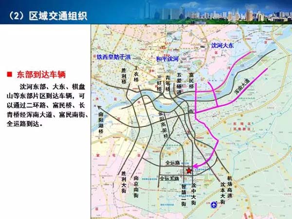 沈河?xùn)|部、大東、棋盤山等東部片區(qū)到達(dá)車輛,可以通過(guò)二環(huán)路、富民橋、長(zhǎng)青橋經(jīng)渾南大道、富民南街、全運(yùn)路到達(dá)。