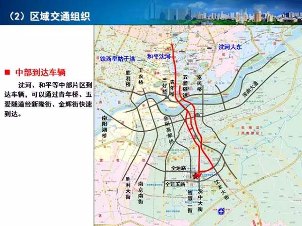 沈河、和平等中部片區(qū)到達(dá)車輛,可以通過(guò)青年橋、五愛(ài)隧道經(jīng)新隆街、金輝街快速到達(dá)。