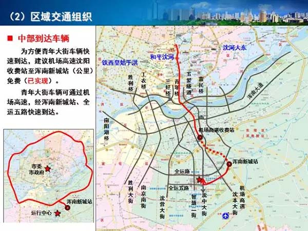 為方便青年大街車輛快速到達(dá),建議機(jī)場(chǎng)高速沈陽(yáng)收費(fèi)站至渾南新城站(公里)免費(fèi)(已實(shí)現(xiàn))。