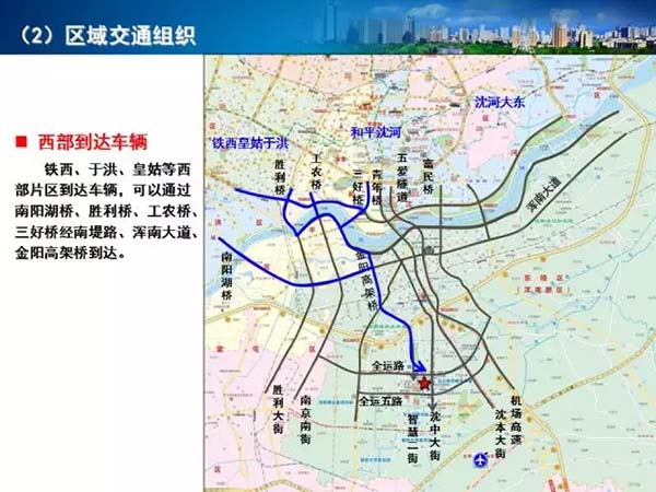 鐵西、于洪、皇姑等西部片區(qū)到達(dá)車輛,可以通過(guò)南陽(yáng)湖橋、勝利橋、工農(nóng)橋、三好橋經(jīng)南堤路、渾南大道、金陽(yáng)高架橋到達(dá)。