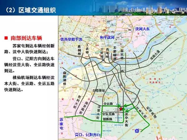 蘇家屯到達(dá)車輛經(jīng)創(chuàng)新路、沈中大街快速到達(dá);營(yíng)口、遼陽(yáng)方向到達(dá)車輛經(jīng)沈營(yíng)大街、全運(yùn)路快速到達(dá)。桃仙機(jī)場(chǎng)到達(dá)車輛經(jīng)沈本大街、全運(yùn)路、全運(yùn)五路快速到達(dá)。