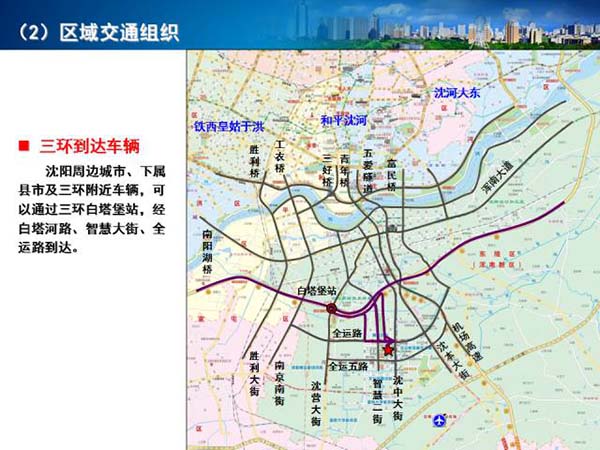 沈陽(yáng)周邊城市、下屬縣市及三環(huán)附近車輛,可以通過(guò)三環(huán)白塔堡站,經(jīng)白塔河路、智慧大街、全運(yùn)路到達(dá)。