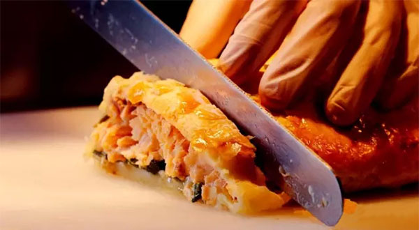 這道烤挪威酥皮三文魚,選取新鮮的挪威三文魚,除去魚骨、魚皮,用海鹽、百里香等秘制調(diào)料腌制2小時(shí)以上。松軟的酥皮將其緊緊地包裹,再以黃油和秘制醬汁淋于表面,中火烤制而成??诟猩贤馑掷锬?,品味三文魚鮮美的同時(shí),還混合著黃油的香味。