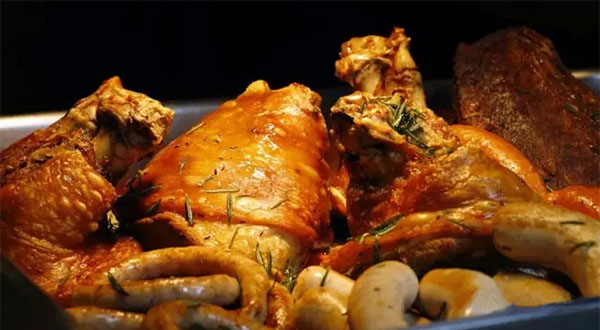 德國(guó)咸豬肘,選用肉質(zhì)鮮嫩的豬前肘,浸泡于月桂葉、杜松漿果調(diào)制的鹽水中至少24小時(shí)。次日,先以大火蒸、再用秘制調(diào)料刷,最后再經(jīng)過180度和220度的兩輪烤制,方可上桌兒。這樣的做法,讓豬皮充分膨脹、入口酥脆,外焦里嫩到了骨子里。