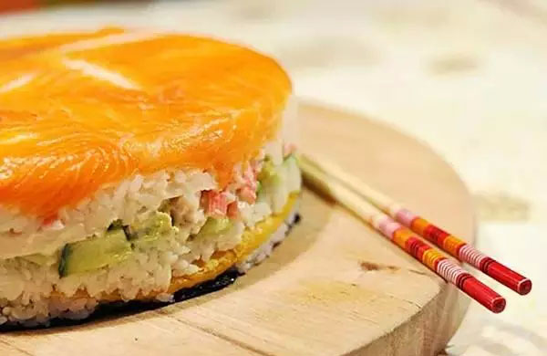 箱壽司又叫做笹壽司、木條壽司,主要流行于關(guān)西地區(qū),用小木箱(押箱)輔助制作壽司。先把配料鋪在押箱的最底層,再放上米飯,然后用力把箱的蓋子壓下去。作成的壽司會變成四方形,最后取出切成小塊。