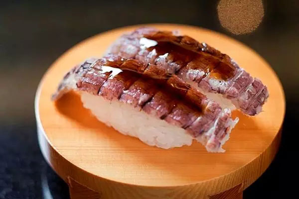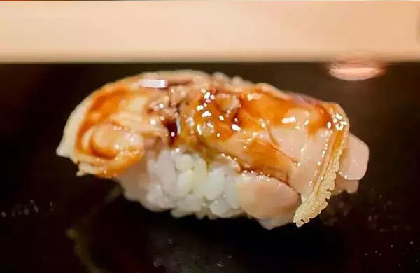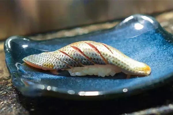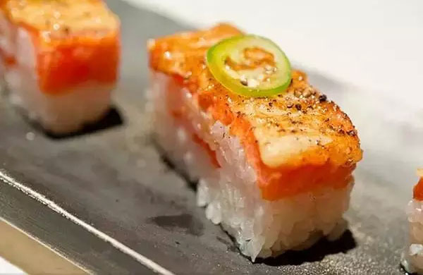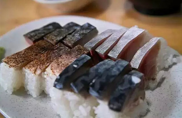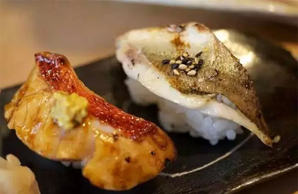 炙烤壽司,用噴槍對握壽司的食材進(jìn)行輕度的炙烤,給食材稍稍加熱的同時,也可以讓一部分食材散發(fā)出脂類焦化和成熟后特有的香氣。通常在白身魚和青魚等脂類含量高的品種上選擇炙烤。