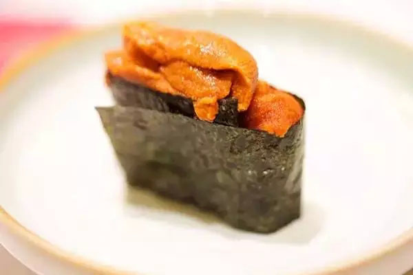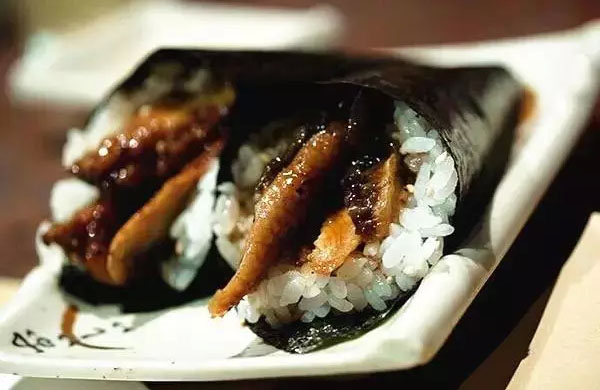 軍艦卷,一般認(rèn)為軍艦卷的歷史并不悠久,可能產(chǎn)生于二戰(zhàn)前后,其形態(tài)像是海軍軍艦。軍艦卷用烘焙干的紫菜片圍繞調(diào)味飯團(tuán)一圈,在軍艦卷的凹槽中可以加入一些質(zhì)地柔軟,松散不易成型的食材,比如海膽、鮭魚籽和貝柱等。這種壽司的發(fā)明極大擴(kuò)展了壽司食材的范圍,使得一些不易成型的食材也可以制作成壽司。